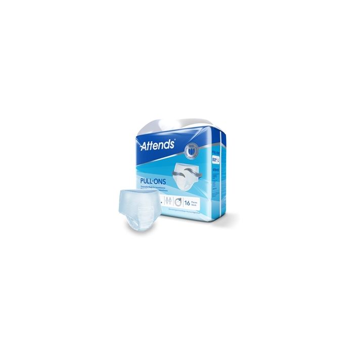 Attends Pull-Ons 8 L är en byxmodell av all-in-one-skydd för svår inkontinens. Skyddet passar både kvinnor och män och är lätt att ta på och av. Pull-Ons-seriens inkontinensskydd har en bred, elastisk midjeresår som garanterar utmärkt passform och komfort.