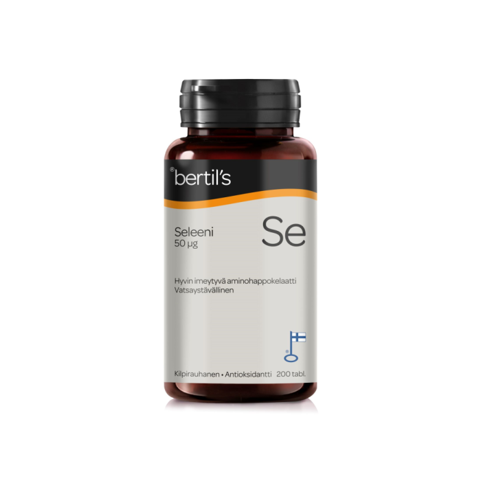 Kotimaiset bertil’s Seleeni -tabletit sisältävät aminohappokelatoitua seleeniä. Kilpirauhashormonit säätelevät kasvua ja elimistön yleistä aineenvaihduntaa, mikä heijastuu merkittävästi yleiseen vireystilaamme. Seleeni on myös elintärkeä hivenaine elimistömme antioksidanttijärjestelmän toiminnalle ja tukee miesten hedelmällisyyttä.